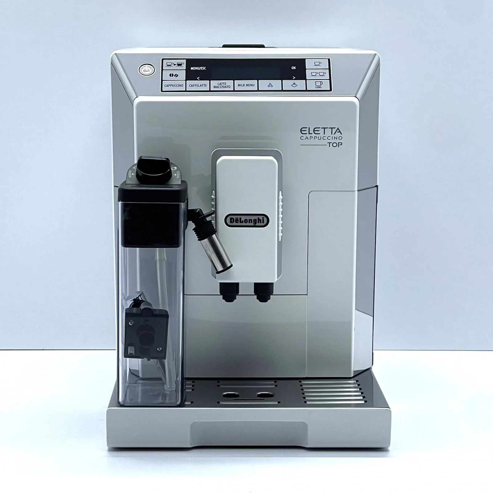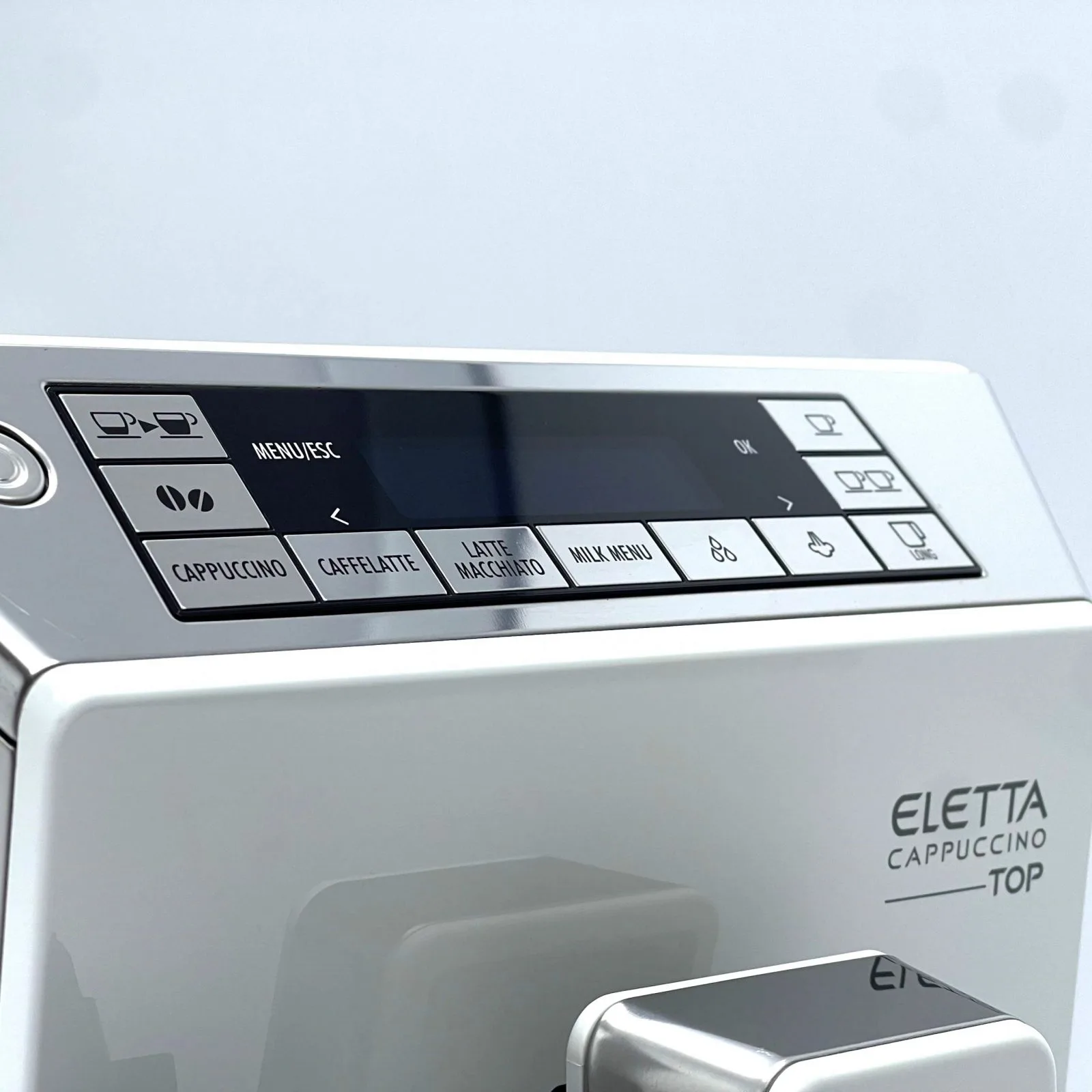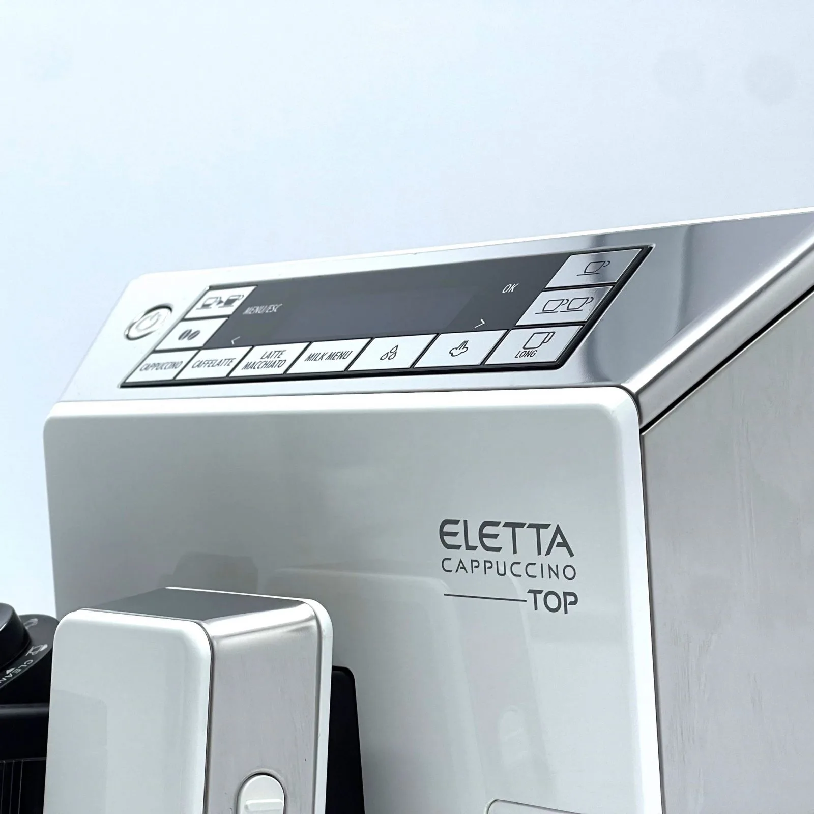 DeLonghi Eletta Cappuccino Top White — це стильна автоматична кавомашина для дому або офісу, яка готує класичний еспресо, капучино, лате макиато та інші напої одним натисканням. Завдяки автоматичному капучинатору та сенсорній панелі з дисплеєм, керування машиною максимально просте та зрозуміле.