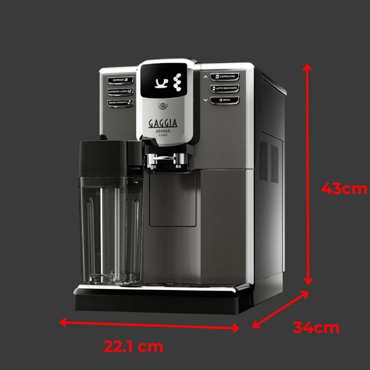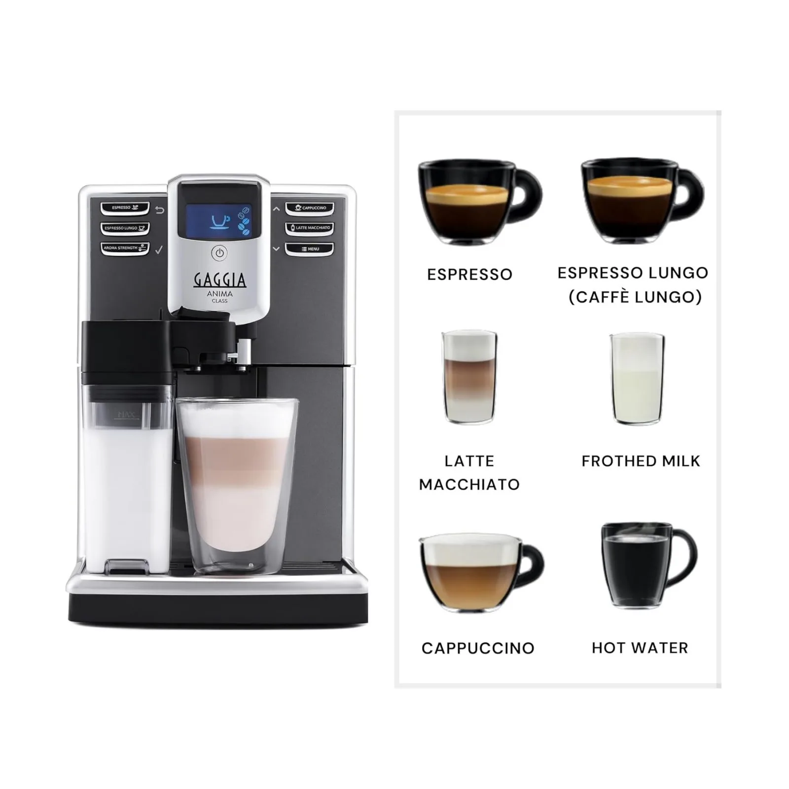 Gaggia Anima Class OTC — це автоматична кавоварка з функцією приготування напоїв з молоком одним натисканням. Завдяки системі One Touch Cappuccino (OTC) ви зможете за кілька секунд отримати ідеальний капучино або лате макиато — без потреби збивати піну вручну.