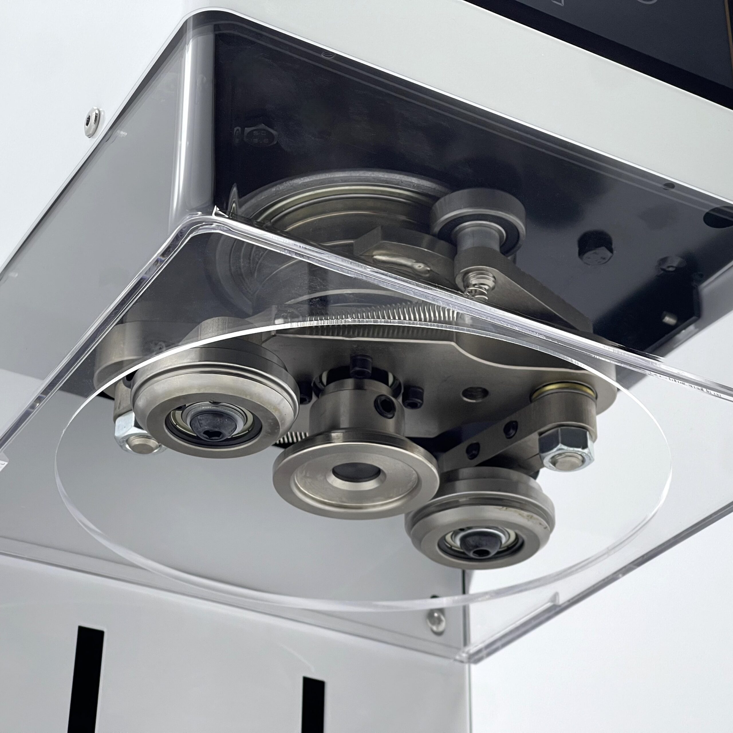 Корпус виконаний у білому кольорі, що гармонійно вписується у сучасний інтер’єр. На фронтальній панелі розташований сенсорний дисплей, який запускає повний цикл закатування. Немає складних налаштувань чи режимів — працівник просто встановлює банку, натискає кнопку, і машина автоматично виконує ідеальну закатку.