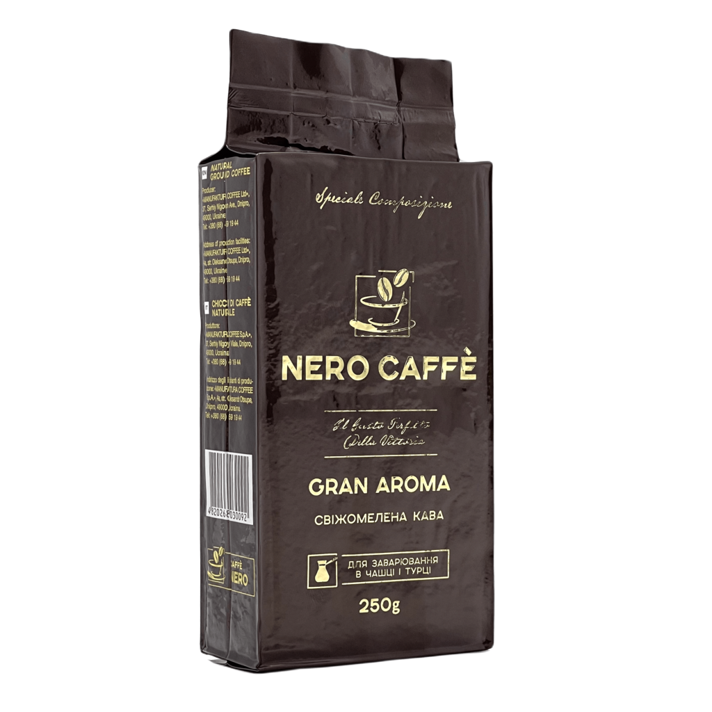 Молотый кофе Nero Caffe Gran Aroma дарит насыщенный вкусовой опыт. Легкая кислинка плавно переходит в сладковатые оттенки, дополненные насыщенным послевкусием с легким намеком на горчинку. Благодаря высокому содержанию арабики, напиток имеет сбалансированный вкус и отличную кремовую пенку, что делает его идеальным для приготовления классического эспрессо, капучино или заплаты.